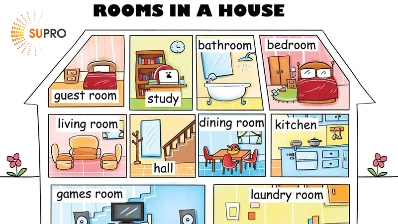 Dưới đây là danh sách từ vựng quen thuộc theo từng khu vực trong ngôi nhà, giúp bé dễ ghi nhớ hơn.